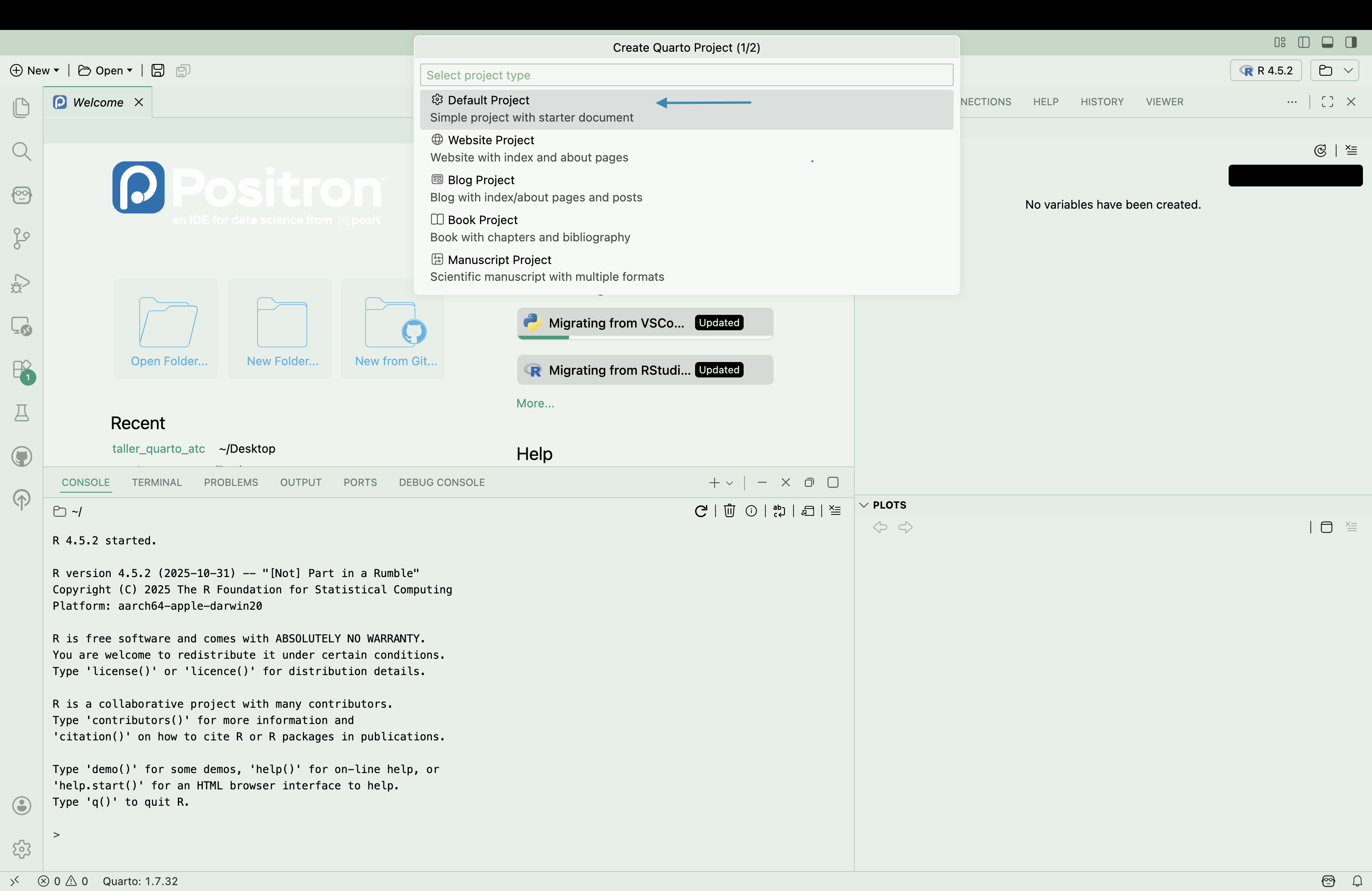 Con Quarto también podemos crear sitios web, blogs, libros, etc. los cuales podemos empezar desde 0 al elegir un tipo de proyecto en el panel inicial en Positron.